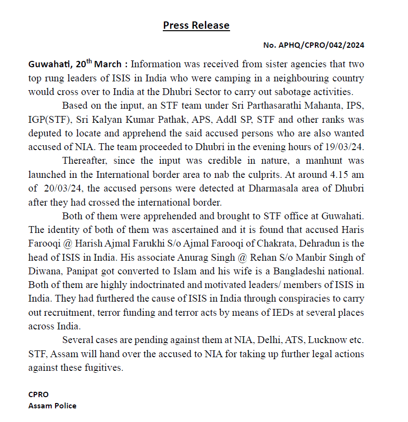 इनपुट के आधार पर, श्री पार्थसारथी महंत, आईपीएस, आईजीपी (एसटीएफ), श्री कल्याण कुमार पाठक, एपीएस, अतिरिक्त एसपी, एसटीएफ और अन्य रैंकों के तहत एक एसटीएफ टीम को उक्त आरोपी व्यक्तियों का पता लगाने और पकड़ने के लिए नियुक्त किया गया था, जो वांछित आरोपी भी हैं। एनआईए. टीम 19/03/24 की शाम को धुबरी के लिए रवाना हुई।