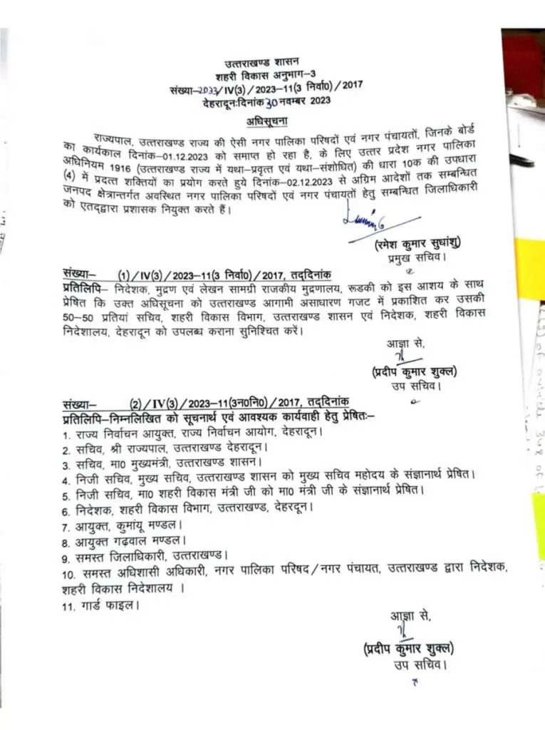 ) नगर पालिका और नगर पंचायतों को लेकर आज बड़ा फैसला लिया गया है। अब यहां पर प्रशासक की तैनाती कर दी गई है। इसके आदेश जारी कर दिए हैं।राज्यपाल उत्तराखण्ड ने राज्य की ऐसी नगर पालिका परिषदों एवं नगर पंचायतों, जिनके बोर्ड का कार्यकाल 1.12 2023 को समाप्त हो रहा है के लिए उत्तर प्रदेश नगर पालिका अधिनियम 1916 (उत्तराखण्ड राज्य में यथा-प्रवृत्त एवं यथा-संशोधित) की धारा 10क की उपधारा (4) में प्रदत्त शक्तियों का प्रयोग करते हुये जनपद क्षेत्रान्तर्गत अवस्थित नगर पालिका परिषदों एवं नगर पंचायतों हेतु सम्बन्धित जिलाधिकारी को एतद्वारा प्रशासक नियुक्त करते हैं।