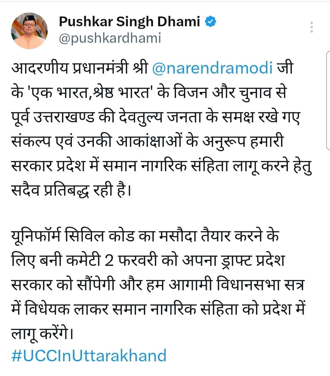 देहरादून: उत्तरारखंड से बड़ी खबर है। जिस बात का सभी को इंतजार था, वो अब खत्म होने वाला है। यूनिफॉर्म कॉमन सिविल कोड (UCC) राज्य में जल्द लागू होने वाला है। सरकार पहले इस बात के संकेत दे चुकी है। अब मुख्यमंत्री पुष्कर सिंह धामी ने सोशल मीडिया के जरिए इस बात की जानकारी दी है कि यूसीसी के लिए गठित समिति 2 फरवरी को अपना UCC ड्राफ्ट सरकार को सौंपेगी।