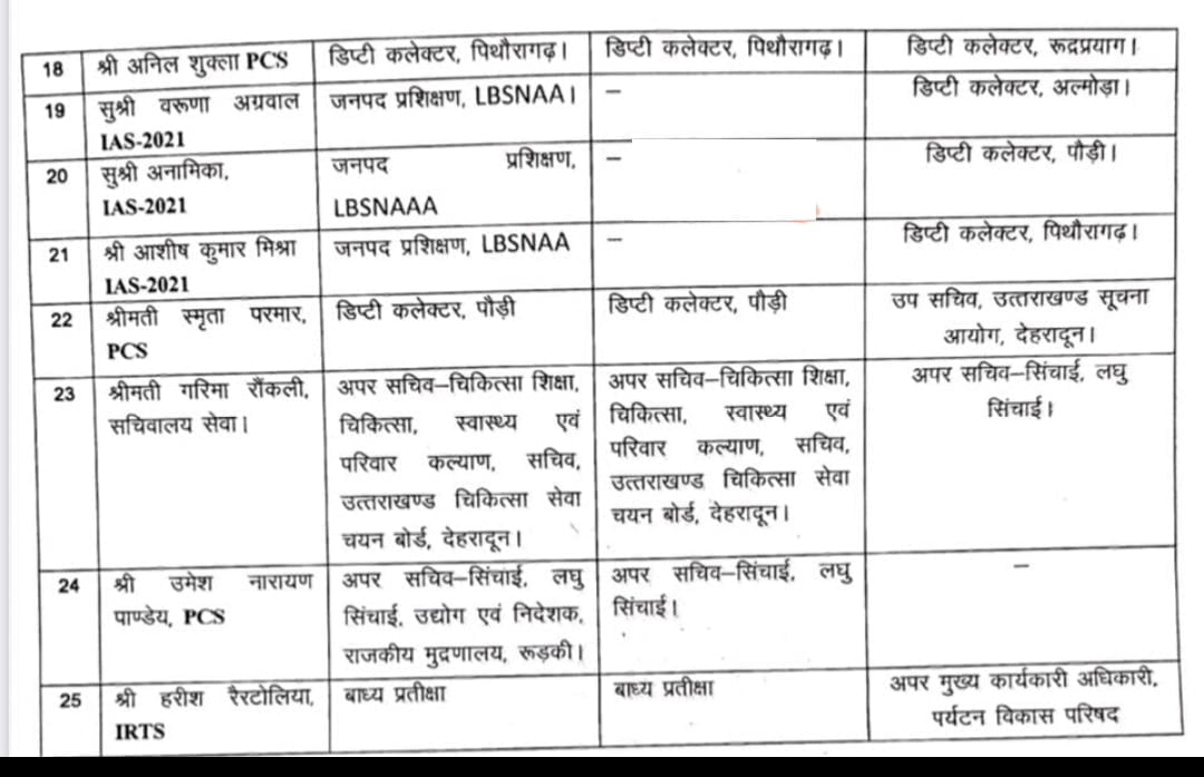 देहरादून : शासन ने बड़े स्तर पर IAS और PCS अधिकारियों के तबादले किए हैं। इनमें कई जिलों के CDO, ज्वाइंट मजिस्ट्रेट, डिप्टी कलेक्ट्रेट और कुछ अन्य विभागों के अधिकारियों का भी ट्रांसफर किया गया है।