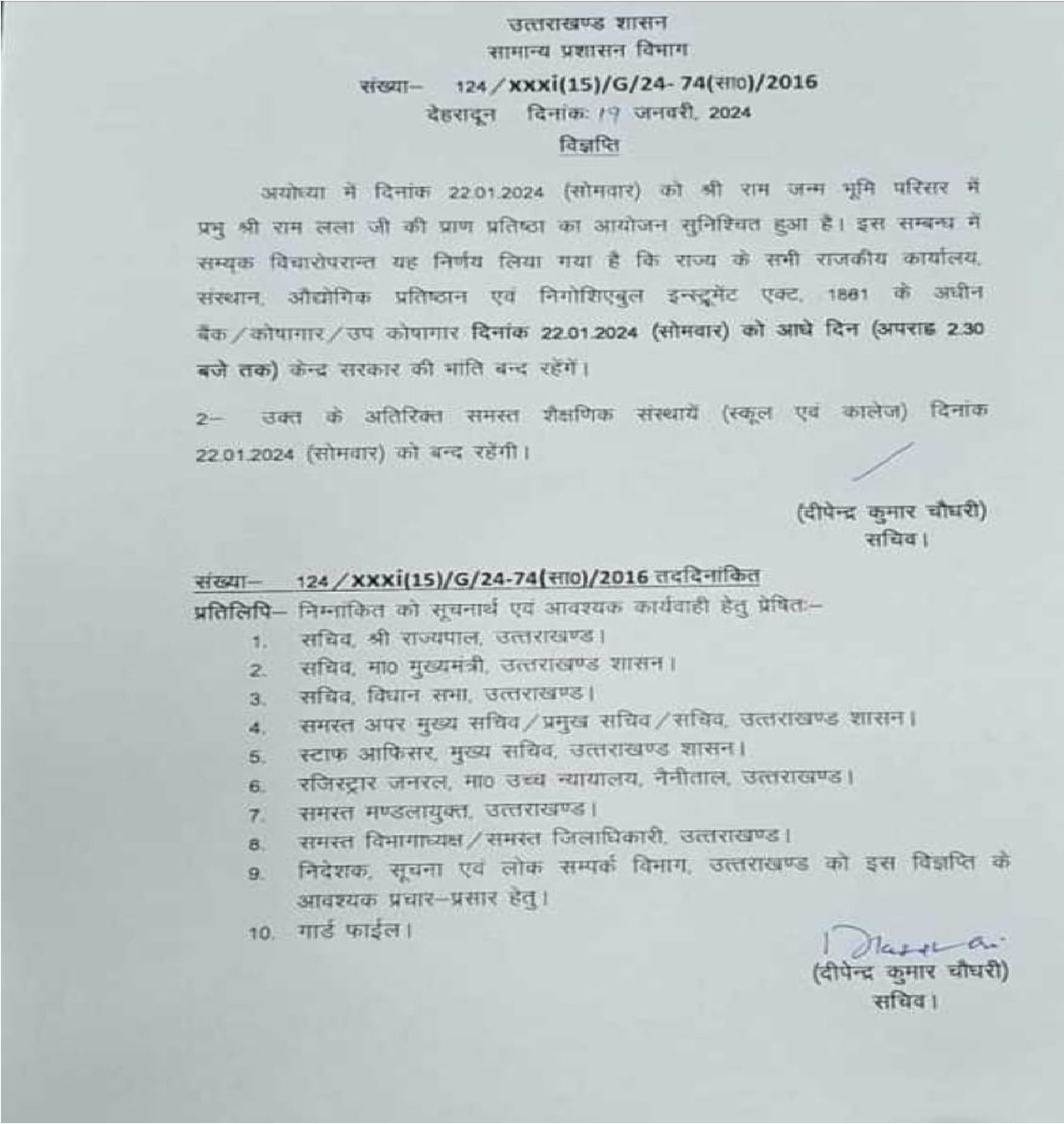 अयोध्या में राम मंदिर प्राण प्रतिष्ठा समारोह को लेकर उत्तराखंड सरकार ने 22 जनवरी को सरकारी दफ्तरों में आधे दिन की छुट्टी घोषित की है। इस संबंध में आदेश जारी कर दिए गए हैं। आदेश के बाद कर्मचारी नेताओं ने कहा कि सरकार द्वारा सरकारी कार्यों में आधा दिन का अवकाश किया गया है जो की औचित्यहीन है।