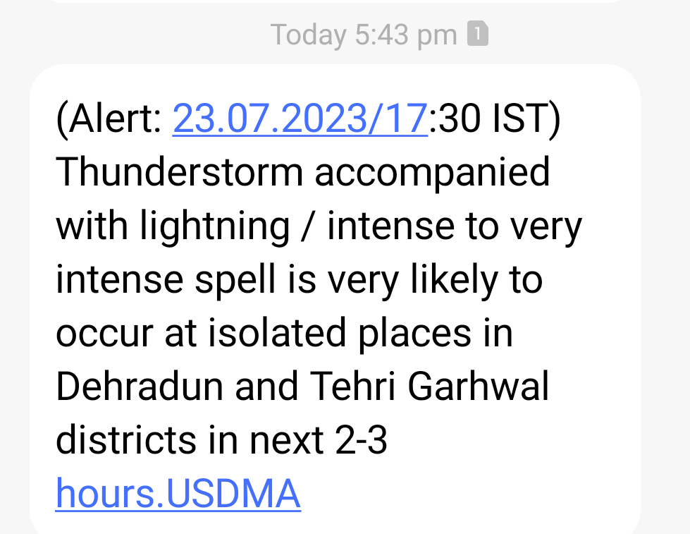 इस बीच मौसम विभाग में अगले 2-3 घंटों के लिए तात्कालिक अलर्ट भी जारी किया है अलर्ट के अनुसार देहरादून टिहरी जिले के कुछ इलाकों में बहुत तेज बारिश हो सकती है।