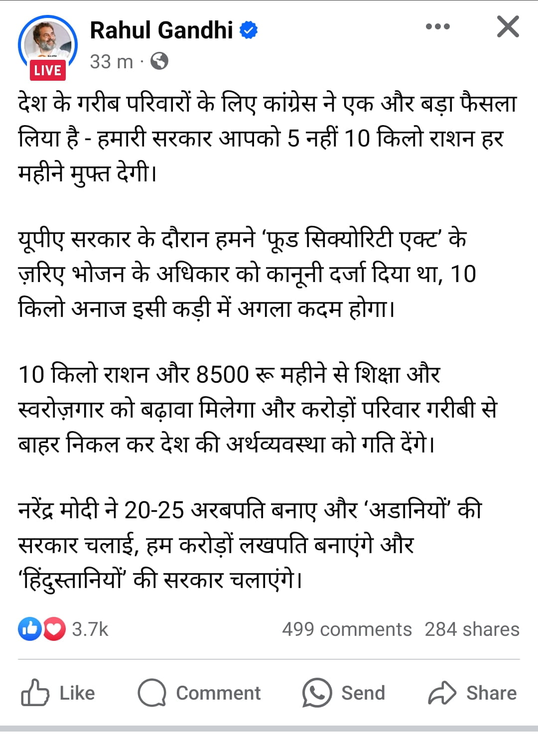 राहुल का कहना है कि यूपीए सरकार के दौरान हमने ‘फूड सिक्योरिटी एक्ट’ के ज़रिए भोजन के अधिकार को कानूनी दर्जा दिया था। 10 किलो अनाज इसी कड़ी में अगला कदम होगा।