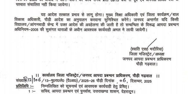पौड़ी: जिला प्रशासन ने मानव-वन्यजीव संघर्ष की बढ़ती घटनाओं और सर्दियों में जल्दी अंधेरा होने के खतरे को देखते हुए बड़ा फैसला लिया है। जिलाधिकारी स्वाति एस. भदौरिया ने पूरे जनपद पौड़ी गढ़वाल में दिसंबर माह के लिए सभी शासकीय, अर्द्धशासकीय, निजी स्कूलों और आंगनबाड़ी केंद्रों के समय में अस्थायी बदलाव के आदेश जारी किए हैं।