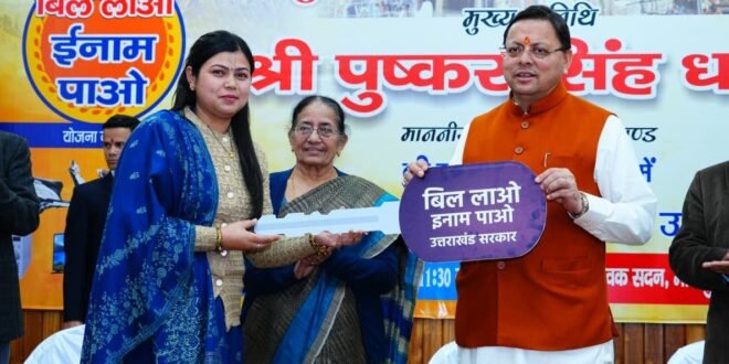 देहरादून : मुख्यमंत्री पुष्कर सिंह धामी ने मंगलवार को मुख्य सेवक सदन में “बिल लाओ-इनाम पाओ” योजना के विजेताओं को पुरस्कार वितरित किए। 1 सितंबर 2022 से 31 मार्च 2024 तक चली इस योजना में कुल 1888 उपभोक्ताओं ने इनाम जीते।