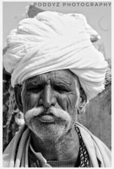 यह फोटो एक वृद्ध व्यक्ति की है, जिनके चेहरे की हर झुर्री जीवन के अनुभवों की कहानी बयान करती है। सफेद पगड़ी और पारंपरिक वेशभूषा में सम्मान और सांस्कृतिक विरासत झलकती है।