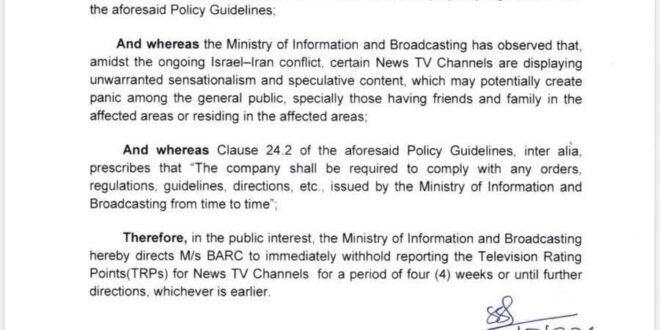 केंद्र सरकार ने इजरायल-ईरान संघर्ष की कवरेज में सनसनीखेज और अटकलबाजी वाली रिपोर्टिंग को रोकने के लिए बड़ा कदम उठाया है। सूचना एवं प्रसारण मंत्रालय ने ब्रॉडकास्ट ऑडियंस रिसर्च काउंसिल (BARC) को निर्देश दिया है कि न्यूज टीवी चैनलों की टेलीविजन रेटिंग पॉइंट्स (TRP) की रिपोर्टिंग तत्काल प्रभाव से चार सप्ताह के लिए या अगले आदेश तक रोक दी जाए।