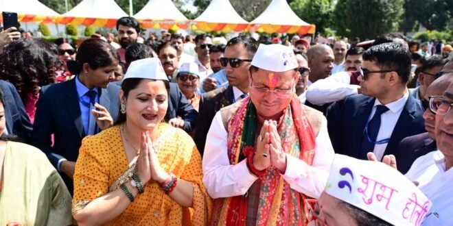 मुख्यमंत्री आवास का प्रांगण सोमवार को होली के रंगों में सराबोर नजर आया। इस दौरान प्रदेश की सांस्कृतिक समृद्धि और एकता के भी दर्शन हुए। पूर्वाह्न से ही प्रदेश भर के लोक कलाकारों, संस्कृति कर्मियों की टोलियां होली गायन करते हुए, सीएम आवास पहुंचती रही। एक तरफ गढ़वाल-कुमाऊं से लेकर जौनसार तक का होली गायन था, नृत्य था। इस दौरान होली के गीत गूंजे। पारंपरिक गायन हुआ। ढोल, मंजीरे बजे। पारंपरिक वाद्य यंत्रों की संगत ने होली गीतों के प्रभाव को और बढ़ा दिया। आओ दगड़ियो, नाचा गावा, आ गई रंगीली होली का आह्वान यदि कुमांउ से आए कलाकारों ने किया, तो राठ क्षेत्र के कलाकारों ने गाया-आई डान्ड्यू बसंत, डाली मा मौल्यार।