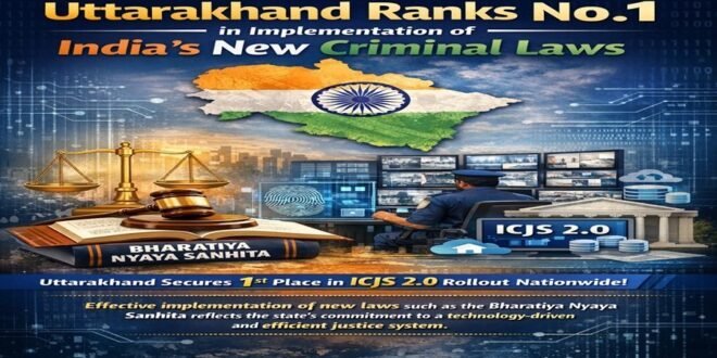 उत्तराखंड ने नए आपराधिक कानूनों के प्रभावी क्रियान्वयन में देश में पहला स्थान हासिल किया है। इंटर-ऑपरेबल क्रिमिनल जस्टिस सिस्टम (ICJS) 2.0 के राष्ट्रीय कार्यान्वयन में राज्य ने शानदार प्रदर्शन करते हुए शीर्ष स्थान प्राप्त किया है। राष्ट्रीय अपराध रिकॉर्ड ब्यूरो (NCRB) द्वारा जारी CCTNS/ICJS प्रोग्रेस डैशबोर्ड के अनुसार, जनवरी 2026 तक उत्तराखंड ने 93.46 के उच्च स्कोर के साथ देश में प्रथम स्थान प्राप्त किया है।