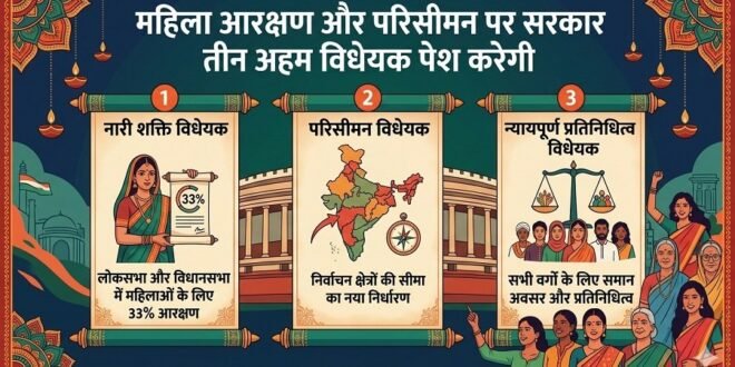 सरकार ने ‘नारी शक्ति वंदन अधिनियम’ को 2029 लोकसभा चुनाव से पहले लागू करने के लिए तीन बिल पेश किए हैं – संविधान (131वां संशोधन) बिल 2026, परिसीमन बिल 2026 और केंद्र शासित प्रदेश संशोधन बिल। इनका मकसद लोकसभा और विधानसभाओं में महिलाओं को 33 प्रतिशत आरक्षण देना है, जिसके लिए जनगणना और परिसीमन जरूरी है। परिसीमन से लोकसभा सीटें 543 से बढ़कर 850 तक हो सकती हैं, लेकिन विपक्ष खासकर दक्षिणी राज्यों (तमिलनाडु, आदि) इसे उत्तर के पक्ष में मानकर विरोध कर रहा है। कांग्रेस समेत INDIA गठबंधन महिला आरक्षण का समर्थन करता है, लेकिन परिसीमन को अलग करने की मांग कर रहा है।