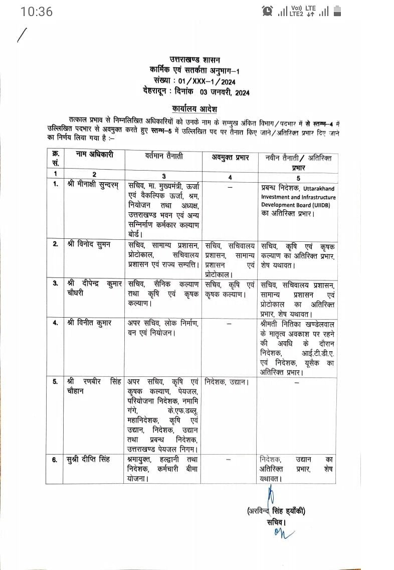 कुल छह अफसरों के प्रभार में बदलाव हुआ है। सचिव आर मीनाक्षी सुंदरम अपने सभी दायित्वों के साथ उत्तराखंड निवेश एवं अवस्थापना विकास बोर्ड (UI IDB) के प्रबंध निदेशक प्रभार भी देखेंगे। अपर सचिव विनीत कुमार अपने दायित्वों के साथ अब ITDA व निदेशक यूसैक का अतिरिक्त प्रभार भी सभालेंगे। ये दायित्व नितिका खंडेवाल के पास थे, जो अभी मातृत्व अवकाश पर हैं। अपर सचिव रणवीर सिंह चौहान से निदेशक उद्यान का प्रभार हटा दिया गया है। श्रमायुक्त दीप्ति सिंह को निदेशक उद्यान का अतिरिक्त प्रभार दिया गया है।