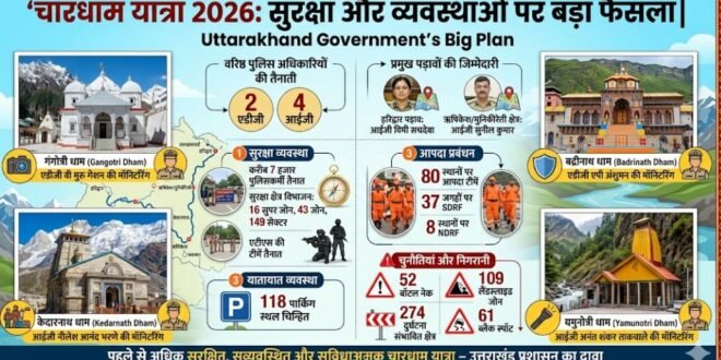 उत्तराखंड में 19 अप्रैल से शुरू होने वाली चारधाम यात्रा को लेकर प्रशासन ने व्यापक तैयारियां पूरी कर ली हैं। यात्रा को सुरक्षित और सुचारू बनाने के लिए वरिष्ठ पुलिस अधिकारियों की विशेष तैनाती की गई है। इस बार 6 वरिष्ठ अधिकारी यात्रा मार्गों की सीधी मॉनिटरिंग और स्थलीय निरीक्षण करेंगे। डीजीपी ने 2 एडीजी और 4 आईजी रैंक के अधिकारियों को अलग-अलग धामों और प्रमुख पड़ावों की जिम्मेदारी सौंपी है।