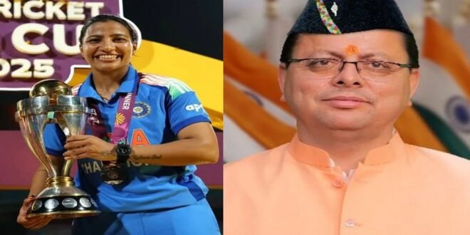 देहरादून। उत्तराखंड के मुख्यमंत्री पुष्कर सिंह धामी ने बुधवार को महिला क्रिकेट विश्व कप 2025 में भारत का प्रतिनिधित्व करने वाली राज्य की बेटी स्नेह राणा से फोन पर बात की और उनके उत्कृष्ट प्रदर्शन के लिए 50 लाख रुपये की प्रोत्साहन राशि देने की घोषणा की। सीएम ने स्नेह को भारतीय टीम में चयन और विश्व कप में भारत की जीत में योगदान के लिए हार्दिक बधाई दी। उन्होंने कहा कि स्नेह राणा ने मेहनत, संकल्प और प्रतिभा से उत्तराखंड का नाम विश्व पटल पर रोशन किया है।