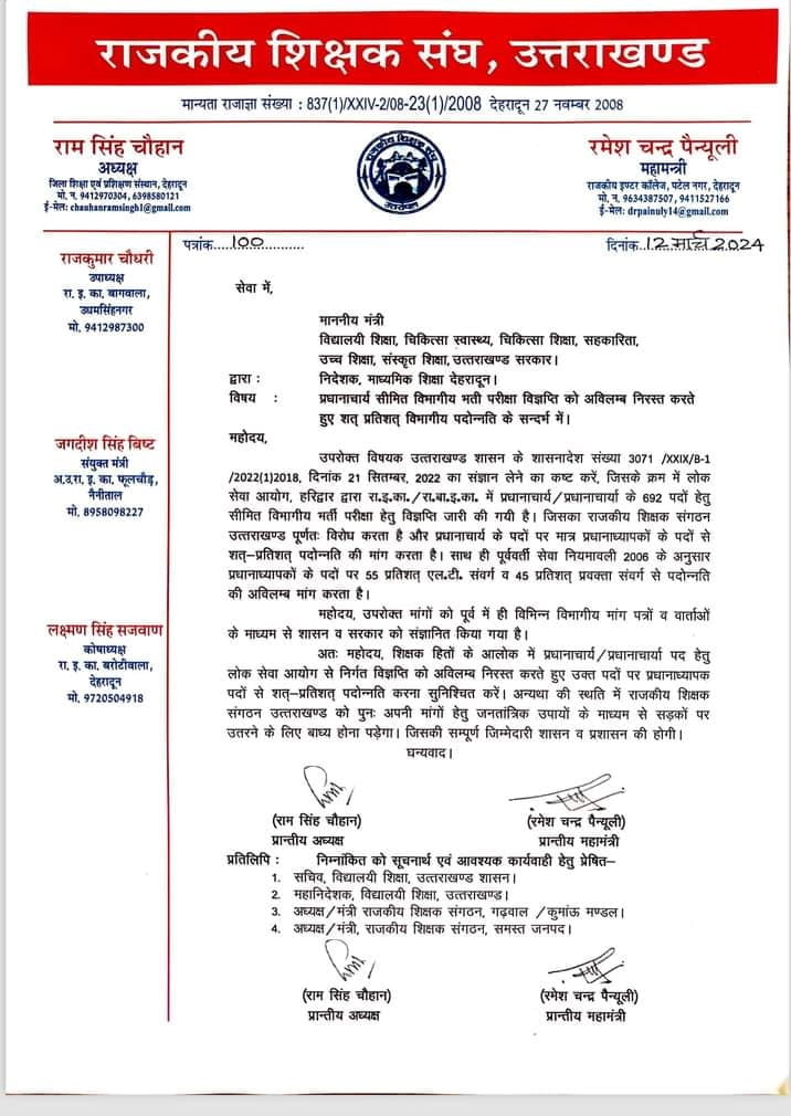 Dehradun : राजकीय विद्यालयों में प्रधानाचार्यों के पदों को आयोग से भरे जाने की विज्ञप्ति निकलते ही शिक्षक आग बबूला हो गए हैं। राजकीय शिक्षक संघ की प्रांतीय कार्यकारिणी ने बैठकर कर इस विज्ञप्ति को निरस्त किए जाने और रिक्त सभी पदों को पदोन्नति से भरे जाने की मांग की है।