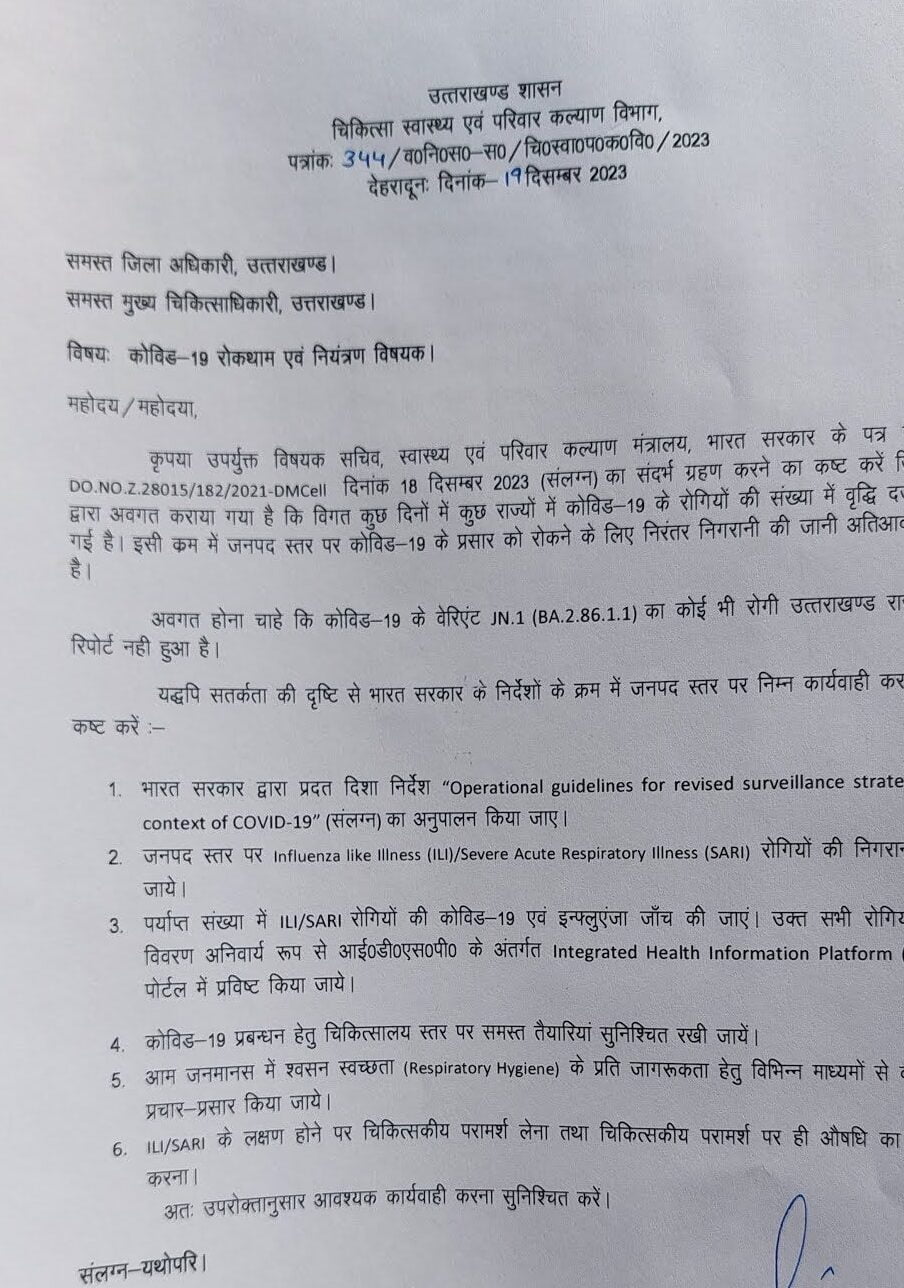 भारत सरकार के स्वास्थ्य सचिव की ओर जारी आदेश में कहा गया है कि पिछले कुछ दिनों में कुछ राज्यों में कोविड-19 के रोगियों की संख्या में वृद्धि दर्ज की गई है। इसी कम में जनपद स्तर पर कोविड-19 के प्रसार को रोकने के लिए निरंतर निगरानी की जानी अतिआवश्यक है। हालांकि, कोविड-19 के वेरिएंट JN.1 (BA.2.86.1.1) का कोई भी रोगी उत्तराखण्ड राज्य में रिपोर्ट नहीं हुआ है।