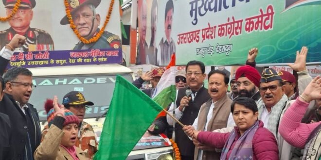 देहरादून: उत्तराखंड प्रदेश कांग्रेस के पूर्व सैनिक विभाग द्वारा अग्निपथ और अग्निवीर योजना के खिलाफ चलाई जा रही जन जागरण यात्रा के दूसरे चरण की शुरुआत आज प्रदेश कांग्रेस मुख्यालय राजीव भवन से हुई। कांग्रेस वर्किंग कमिटी (सीडब्ल्यूसी) सदस्य एवं पूर्व प्रदेश अध्यक्ष करण माहरा ने यात्रा को हरी झंडी दिखाकर रवाना किया।