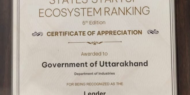 राष्ट्रीय स्टार्टअप दिवस के अवसर पर 16 जनवरी 2026 को दिल्ली में आयोजित समारोह में उत्तराखंड सरकार के उद्योग विभाग को इस उपलब्धि के लिए Certificate of Appreciation प्रदान किया गया। इस संस्करण में कुल 34 राज्य और केंद्र शासित प्रदेशों ने भाग लिया, जिन्हें पांच श्रेणियों में विभाजित किया गया: बेस्ट परफॉर्मर्स, टॉप परफॉर्मर्स, लीडर्स, एस्पायरिंग लीडर्स और इमर्जिंग स्टार्टअप इकोसिस्टम्स।