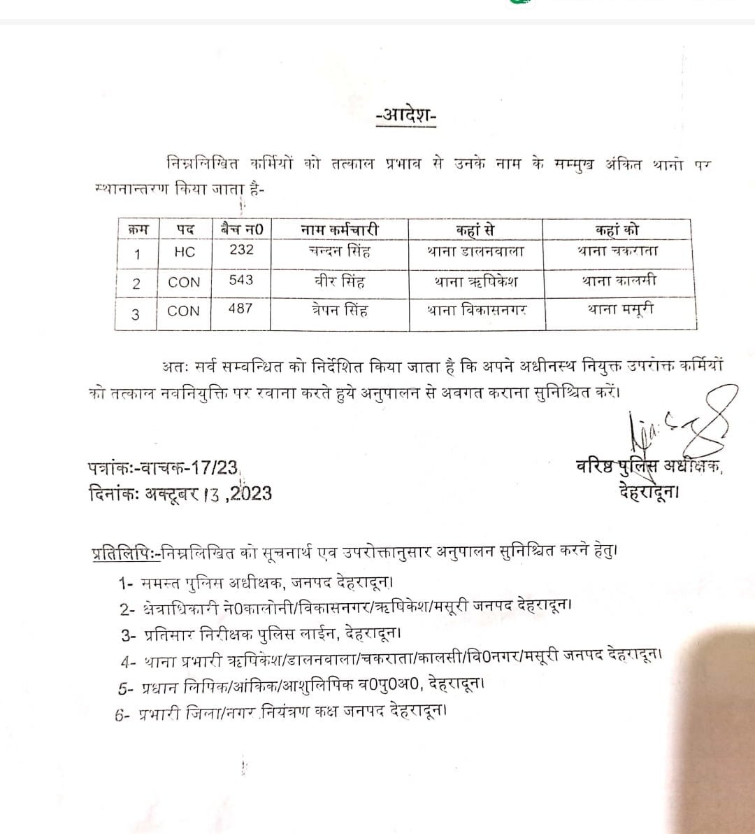 देहरादून: देहरादून SSP अजय सिंह ने बड़ा फेरबदल किया है। उन्होंने एक साथ करीब 150 पुलिस कांस्टेबल और हेडकांस्टेबल का ट्रांसफर कर दिया। इनमें वो पुलिसकर्मी शामिल हैं, जिनको एक ही थाने या कोतवाली में तीन साल से ज्यादा समय से तैनात थे।