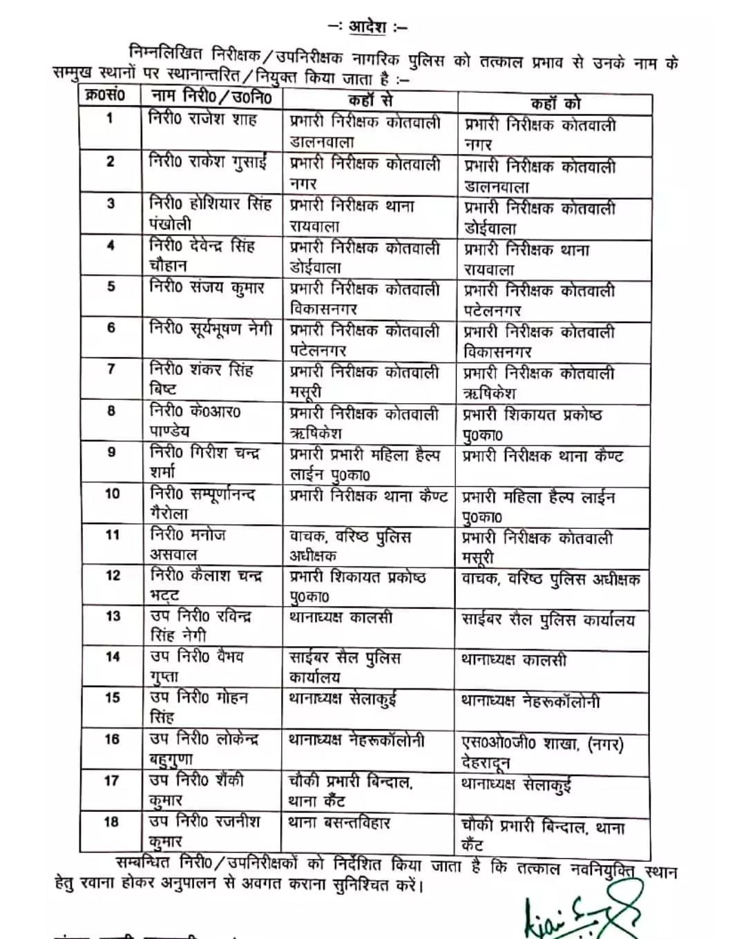 देहरादून : SSP अजय सिंह ने कई थानों और चौकियों की प्रभारियों को इधर से उधर कर दिया है। पिछले दो दिनों में दूसरी बार ट्रांसफर लिस्ट जारी की गई है।