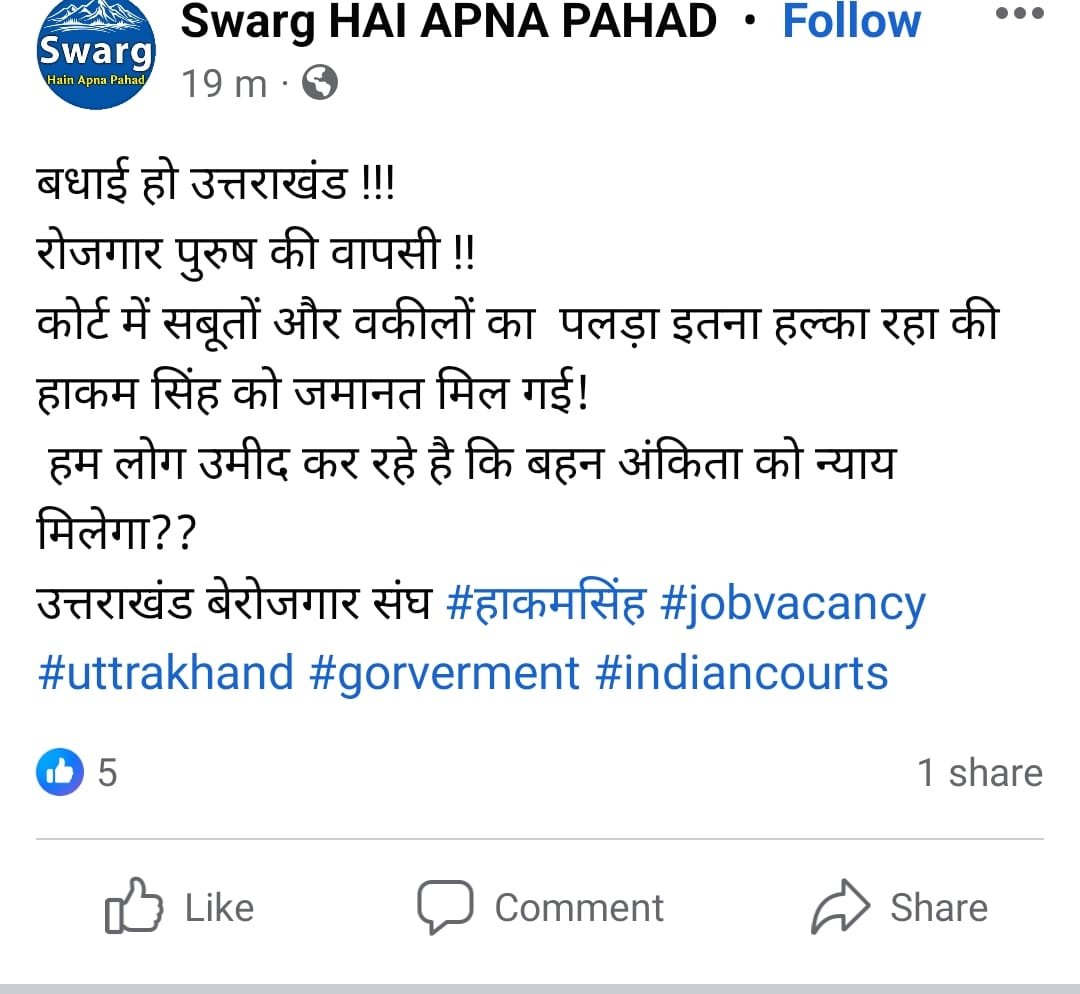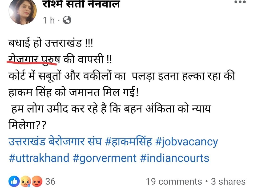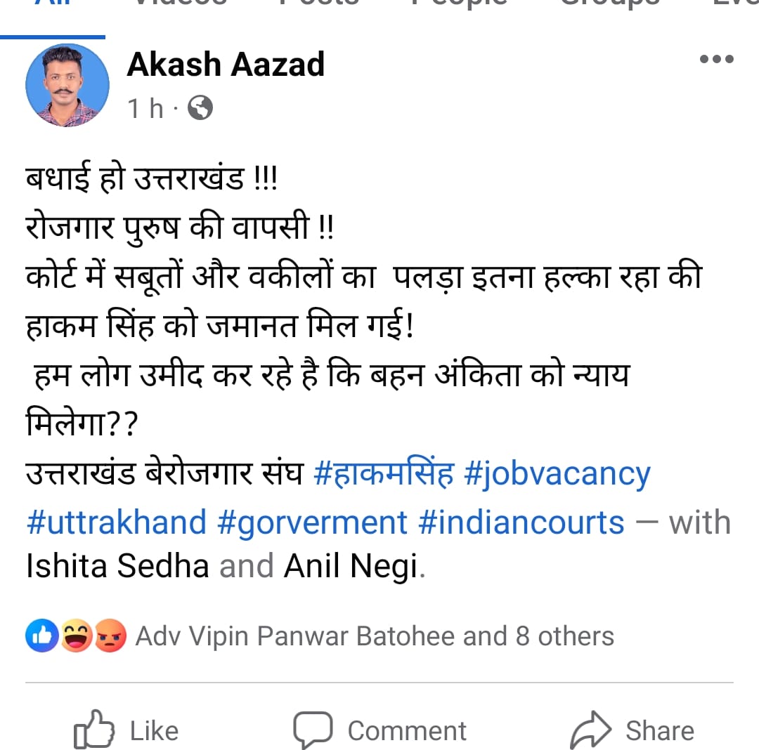 कुछ लोग कह रहे हैं कि क्या वकील और सबूत इतने कमजोर पड़ गए थे कि हाकम सिंह को जमानत मिल गई। और उम्मीद कर रहे हैं कि बहिन अंकिता को न्याय मिलेगा। हाकम को जमानत मिलने से लोग गुस्सा जाहिर कर रहे हैं।