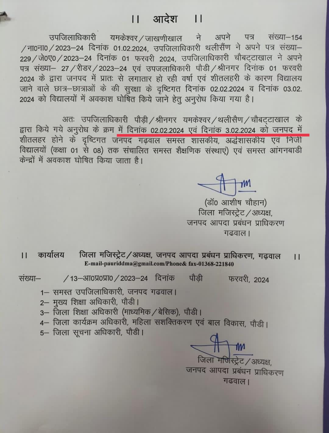 उपजिलाधिकारी पौड़ी, श्रीनगर, यमकेश्वर, थलीसैण और चौबट्टाखाल के द्वारा किये गये अनुरोध के क्रम में 2 और 3फरवरी को जनपद में शीतलहर होने के दृष्टिगत जनपद गढ़वाल समस्त शासकीय, अर्द्धशासकीय एवं निजी विद्यालयों (कक्षा 01 से 08) तक संचालित समस्त शैक्षणिक संस्थाए) एवं समस्त आंगनबाडी केन्द्रों में अवकाश घोषित किया जाता है।