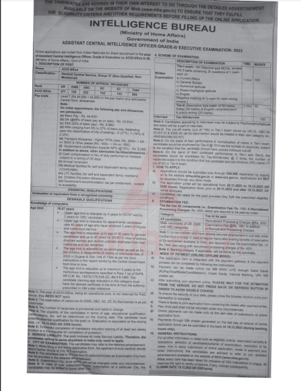 भारत सरकार के गृह मंत्रालय ने इंटेलीजेंस ब्यूरो में जनरल सेंट्रल सर्विस में ग्रुप सी के पदों के अंतर्गत असिस्टेंट सेंट्रल इंटेलीजेंस ऑफिसर ग्रेड 2 / एग्जीक्यूटिव के पदों की भर्ती निकाली है। इंटेलीजेंस ब्यूरो द्वारा रोजगार समाचार सप्ताह 25 नवंबर – 1 दिसंबर 2023 में प्रकाशित विज्ञापन के मुताबिक एसीआइओ-2/एग्जीक्यूटिव के कुल 995 पदों पर भर्ती की जानी है। इसमें 377 पद अनारक्षित हैं, जबकि 222 OBC-NCL, 134 SC, 133 ST और 129 EWS उम्मीदवारों के लिए आरक्षित हैं।