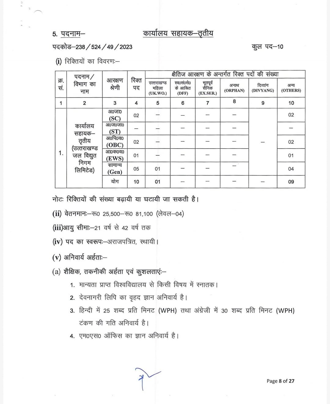 देहरादून: उत्तराखण्ड अधीनस्थ सेवा चयन आयोग (UKSSSC) ने समूह ‘ग’ के अन्तर्गत समाज कल्याण विभाग में सहायक समाज कल्याण अधिकारी के 16 रिक्त पदों, अल्पसंख्यक कल्याण विभाग में सहायक अल्पसंख्यक कल्याण अधिकारी के 05 रिक्त पदों, उत्तराखण्ड राज्य विधिक सेवा प्राधिकरण एवं अधीनस्थ अधिष्ठानों में मुन्सरिम और रीडर के 14 रिक्त पदों, उत्तराखण्ड जल विद्युत निगम लिमिटेड (UJVNL) में कार्यालय सहायक-तृतीय के 10 रिक्त पदों, पॉवर ट्रांसमिशन कारपोरेशन ऑफ उत्तराखण्ड लिमिटेड (PTCUL) में कार्यालय सहायक- तृतीय के 10 रिक्त पदों, उत्तराखण्ड सूचना आयोग में सहायक समीक्षा अधिकारी के 03 रिक्त पदों पर भर्ती निकली है।