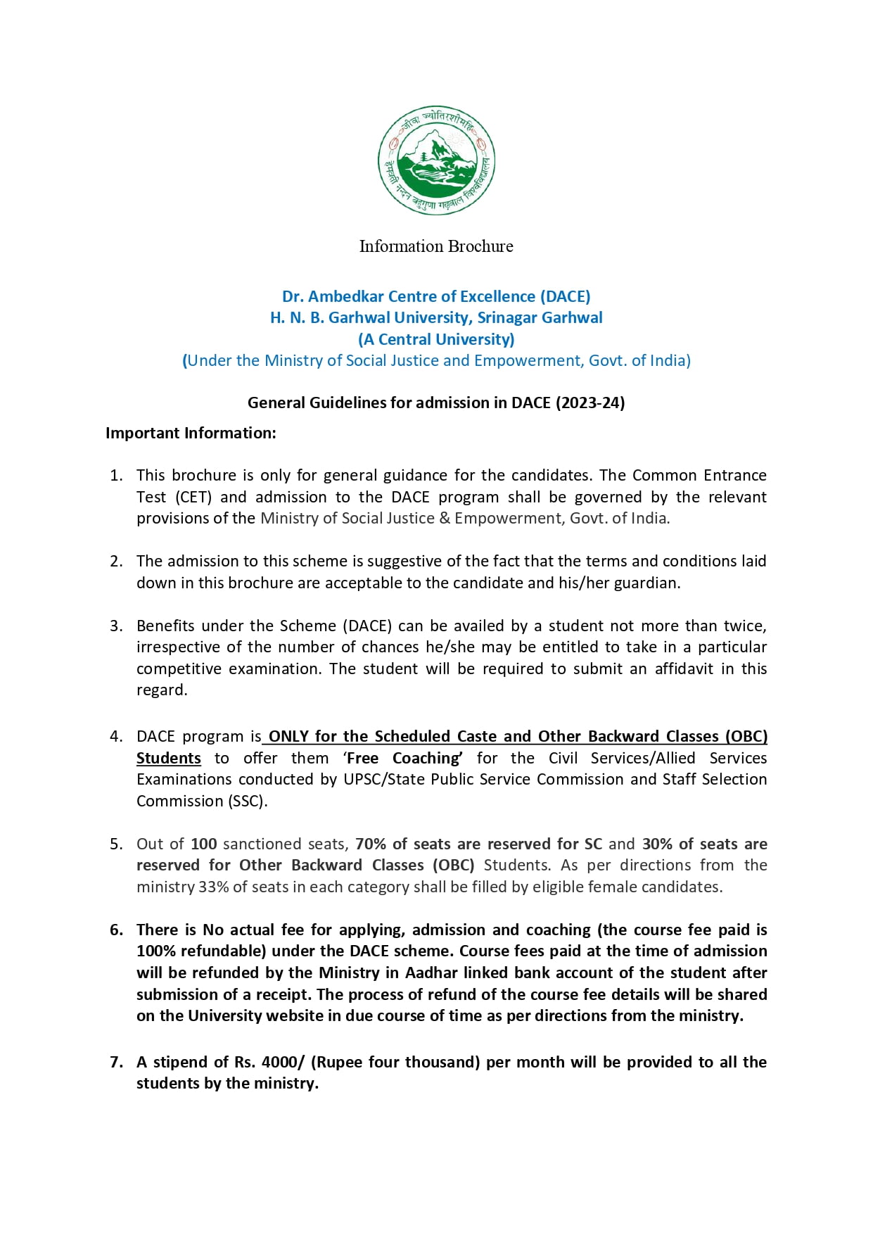 अनुसूचित जाति और अन्य पिछड़ा वर्ग के होनहारों को केंद्रीय सामाजिक न्याय और आधिकारिता मंत्रालय की योजना के तहत गढ़वाल केंद्रीय विश्वविद्यालय में UPSC, SSC की निशुल्क कोचिंग दी जाएगी। इसके लिए सितंबर के आखिरी सप्ताह में कॉमन एंट्रेंस टेस्ट (CET) होगा, जिसकी ऑनलाइन आवेदन प्रक्रिया गढ़वाल विवि ने शुरू कर दी है।