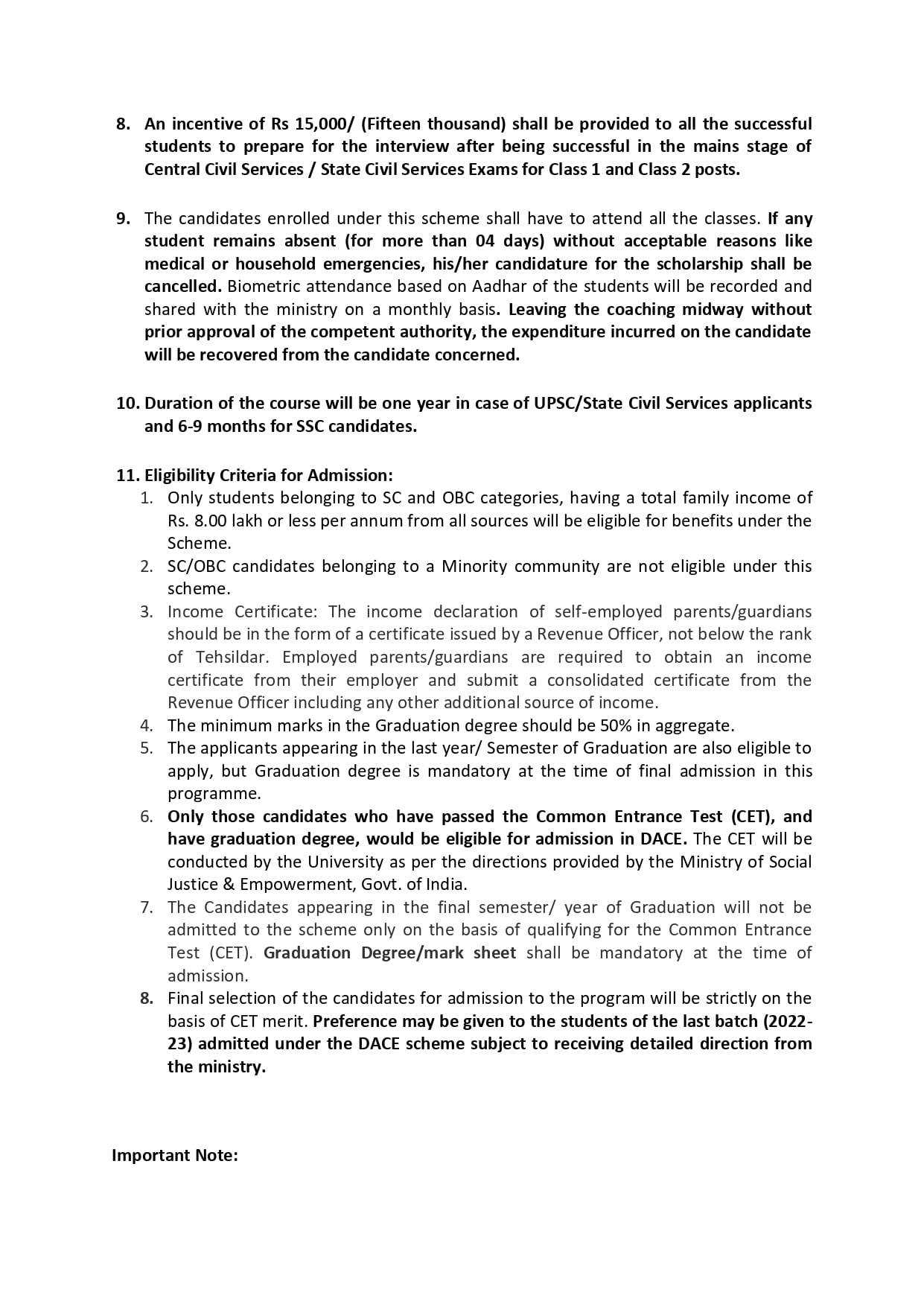 आवेदक OBC या SCश्रेणी का हो। उसके परिवार की वार्षिक आय आठ लाख रुपये से अधिक न हो। स्नातक में कम से कम 50 प्रतिशत अंक हासिल किए हों। दाखिले के लिए सीईटी पास होना जरूरी है। निशुल्क कोचिंग के लिए 100 अंकों की परीक्षा होगी, जिसमें बहुविकल्पीय प्रश्न पूछे जाएंगे। सही जवाब देने पर दो अंक मिलेंगे जबकि चार गलत जवाब देने पर एक अंक काट लिया जाएगा। आवेदकों से जनरल इंग्लिश, जनरल हिंदी, हिस्ट्री, पॉलिटी, इकोनॉमी, कल्चर, जियोग्राफी, जनरल साइंस एंड एनवायरमेंट, रीजनिंग व मेंटल एबिलिटी से सवाल पूछे जाएंगे।