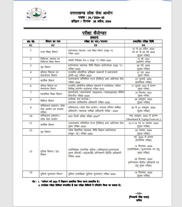 हरिद्वार: लोकसेवा आयोग (UKPSC) ने आयोग की परीक्षाओं का कैलेंडर जारी किसा है। इसमें सभी परीक्षाओं की प्रस्तावित तारीखों की जानकारी दी गई है। यह परीक्षाए मई माह से लेकर दिसंबर माह तक संपन्न होंगी।
