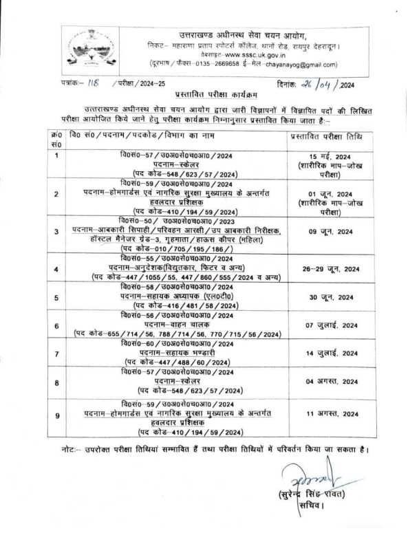 देहरादून: अगर आपने उत्तराखंड अधीनस्थ चयन सेवा आयोग (UKSSSC) की परीक्षाओं के लिए अवोदन किया है। आपका इंतजार जल्द खत्म होने जा रहा है। आयोग ने जारी विज्ञापनों में विज्ञापित पदों की लिखित परीक्षा आयोजित किये जाने हेतु परीक्षा कार्यक्रम प्रस्तावित किया है। अधीनस्थ सेवा चयन आयोग ने मई से लेकर अगस्त माह की 9 परीक्षाओं का कैलेंडर जारी किया है।