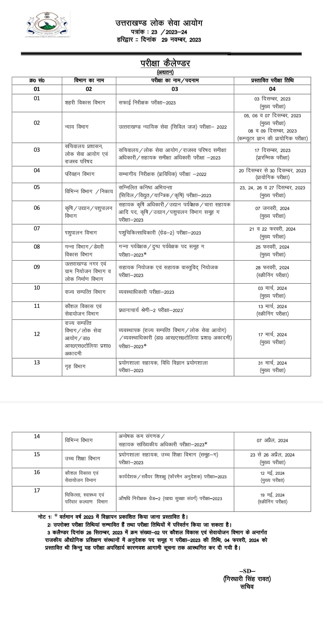 शहरी विकास विभाग सफाई निरीक्षक परीक्षा-2023 03 दिसम्बर, 2023 (मुख्य परीक्षा),न्याय विभाग उत्तराखण्ड न्यायिक सेवा (सिविल जज) परीक्षा- 2022 05, 06 व 07 दिसम्बर, 2023