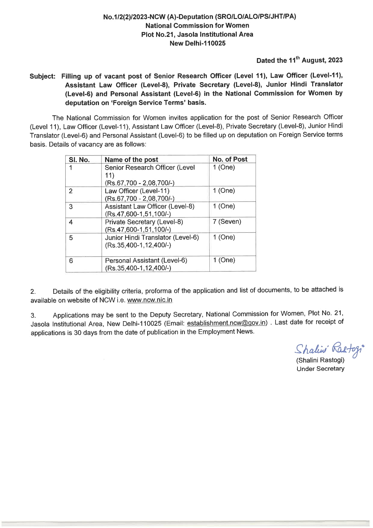 सरकारी नौकरी : अगर आपको भी सरकारी नुकरी की तलाश है तो आपके लिए यहां मौका है। राष्ट्रीय महिला आयोग प्रतिनियुक्ति/आमेलन/पुनर्रोजगार के माध्यम से निम्नलिखित पदों के लिए आवेदन आमंत्रित किये हैं।