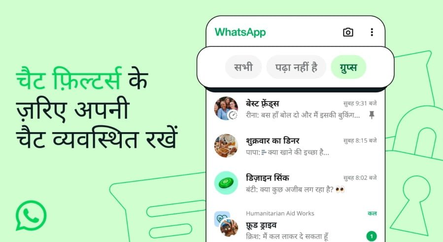 WhatsApp खोलने और सही चैट को ढूँढने की प्रोसेस में ज़्यादा समय नहीं लगना चाहिए और वह आसान होनी चाहिए. जैसे-जैसे WhatsApp का इस्तेमाल बढ़ता जा रहा है, अब यह और भी ज़रूरी हो गया है कि हम अपने मैसेजेस को आसानी से ढूँढ सकें. इसलिए आज हम नए चैट फ़िल्टर्स लॉन्च कर रहे हैं, ताकि आप अपना पूरा इनबॉक्स स्क्रॉल किए बिना किसी भी चैट को आसानी से ढूँढ सकें.