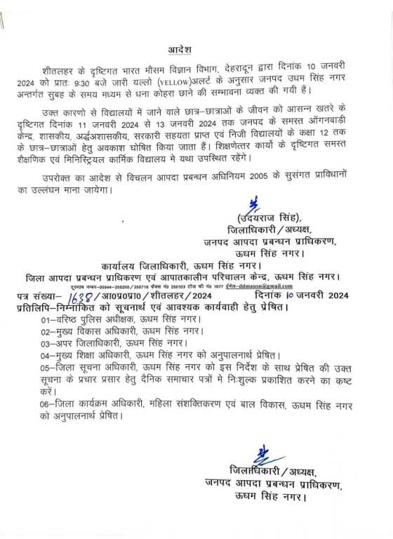 खासकर मैदानी जिलों देहरादून, हरिद्वार और उधमसिंह नगर में कोहरे के कारण ठंड पड़ रही है। भारत मौसम विज्ञान केंद्र की चेतावनी के बाद उधमसिंह नगर जिले में तीन दिनों के लिए स्कूलों की छुट्टी घोषित कर दी गई है।