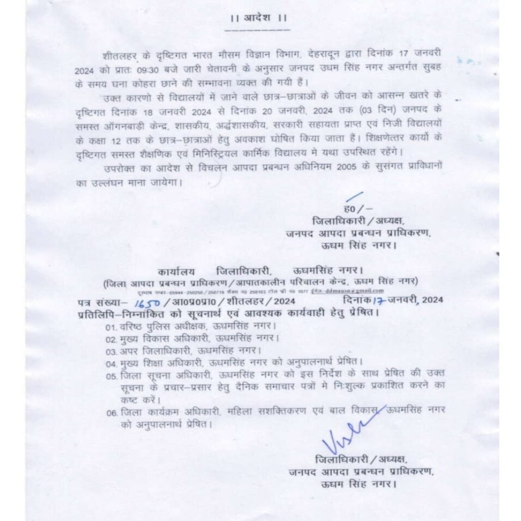 उक्त कारणों से विद्यालयों में जाने वाले छात्र-छात्राओं के जीवन को आसन्न खतरे के दृष्टिगत दिनाक 18 जनवरी 2024 से दिनाक 20 जनवरी, 2024 तक (03 दिन) जनपद के समस्त आंगनवाड़ी केन्द्र, शासकीय अर्द्धशासकीय, सरकारी सहायता प्राप्त एवं निजी विद्यालयों के कक्षा 12 तक के छात्र-छात्राओं हेतु अवकाश घोषित किया जाता है।