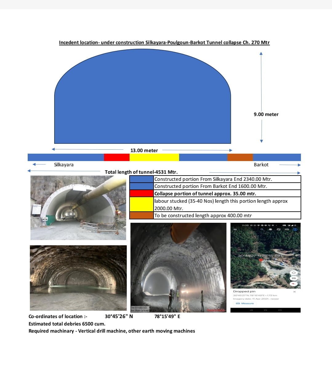 NHDCL के पूर्व प्रबन्धक ने बताया कि ब्रहम्खाल-पोलगांव निर्माणाधीन रोड टनल जो सिलक्यार से लगभग 2340 मीटर निर्माण की गयी है के सिलक्यार की तरफ से टनल के 270 मीटर भाग के पास 30 मीटर क्षेत्र में मलवा आने के कारण टनल के अन्दर की ओर लगभग 35-40 मजदूर फंसे होने की सूचना दी गयी।