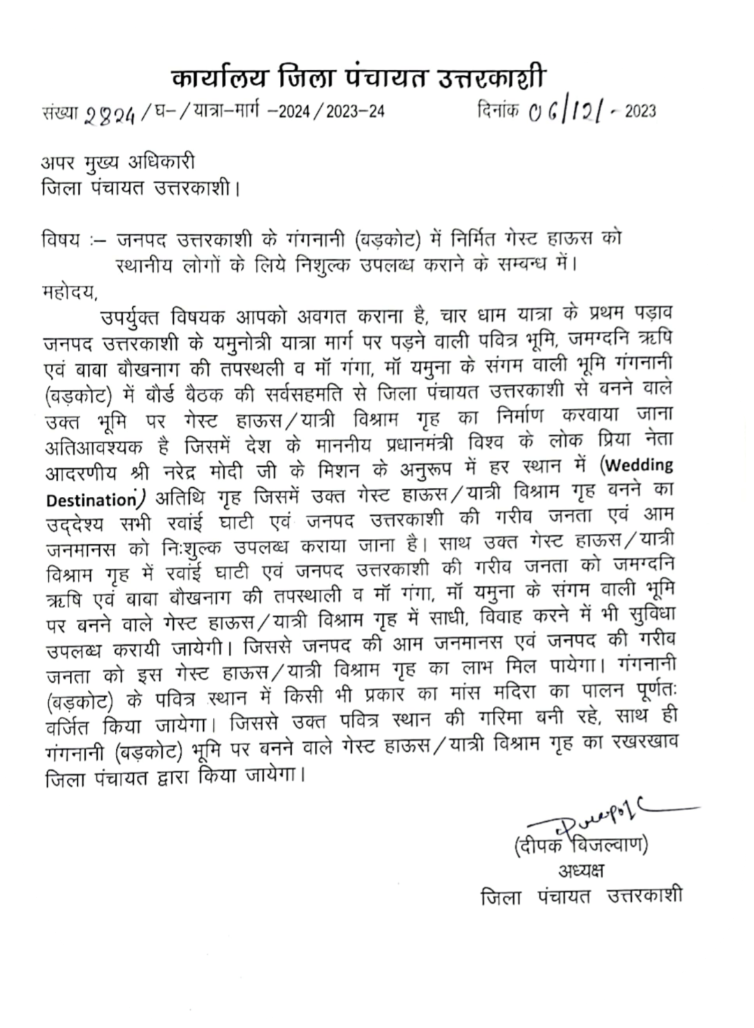 जिसमें प्रधानमंत्री विश्व के लोक प्रिय नेता नरेंद्र मोदी के मिशन के अनुरूप में हर स्थान में (Wedding Destination) अतिथि गृह, जिसमें उक्त गेस्ट हाऊस / यात्री विश्राम गृह बनने का उद्देश्य सभी रवांई घाटी एवं जनपद उत्तरकाशी की गरीब जनता एवं आम जनमानस को निःशुल्क उपलब्ध कराया जाना है।