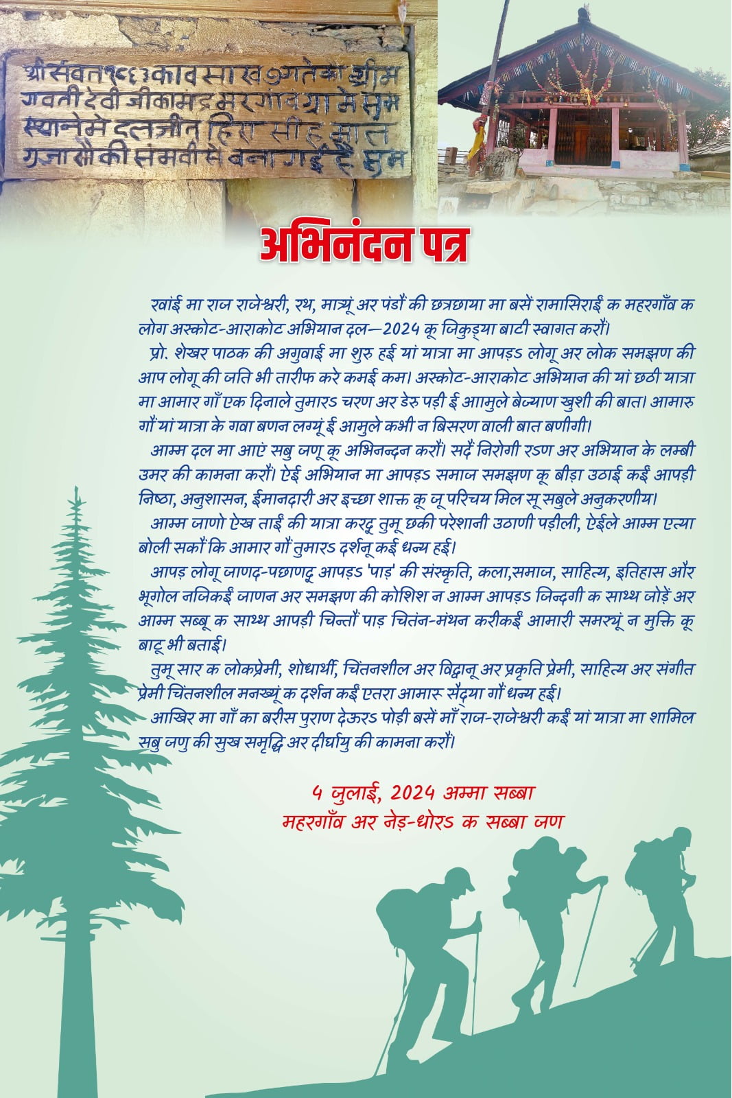 अस्कोट -आराकोट अभियान -2024 का दल 4 जुलाई 2024 को मेरे आमंत्रण पर हमारे गांव महरगांव पहुंचा। भारी बारिश के बावजूद सब ठीक रहा। पद्मश्री डॉ. शेखर पाठक की अगुवाई में चल रहे दल का गांव मे तिलक लगाकर व ‘केदारपातरी’ भेंटकर स्वागत किया गया, फिर उनका शाल ओढ़ाकर सम्मान और अभियान दल को अभिनंदन पत्र व स्मृति चिन्ह भेंट किया गया।