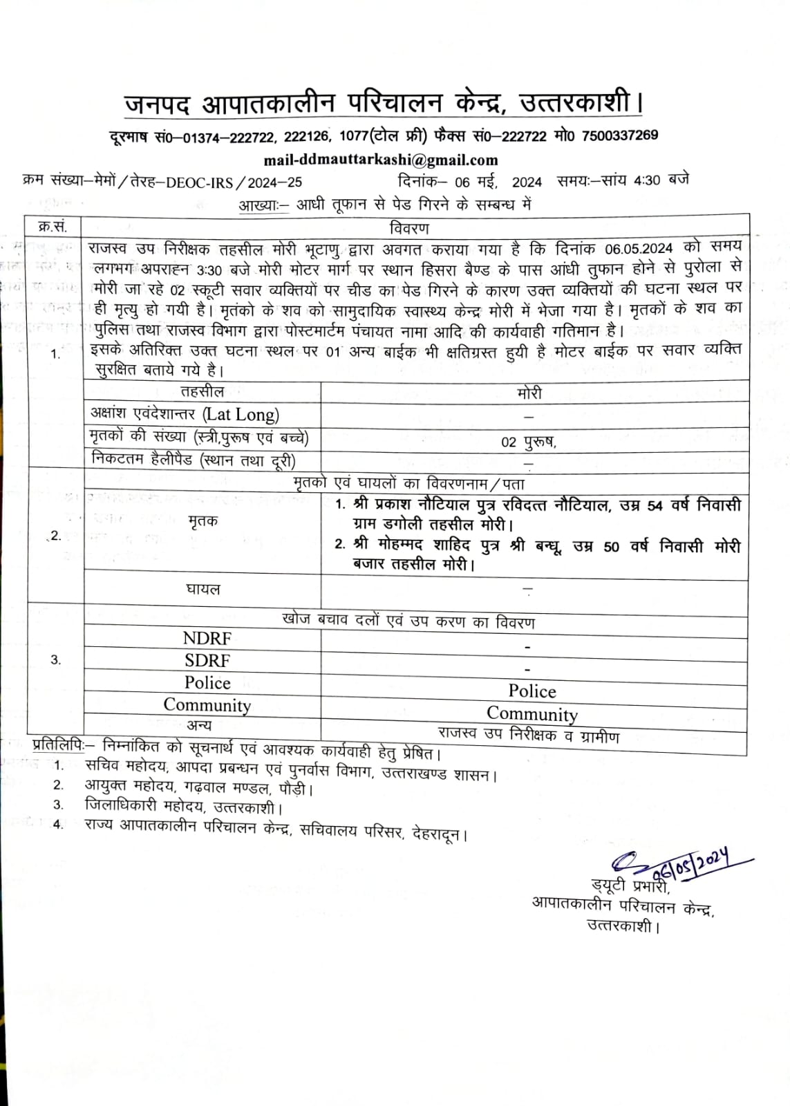 राजस्व उप निरीक्षक तहसील मोरी भुटाणू द्वारा अवगत कराया गया है कि मोरी मोटर मार्ग पर स्थान हिसार बैण्ड के पास तेज आंधी तूफान होने से चीड़ का पेड़ गिरने से दो व्यक्तियों की पेड़ की चपेट में आने के कारण घटना स्थल पर ही मृत्यु हुई है ।