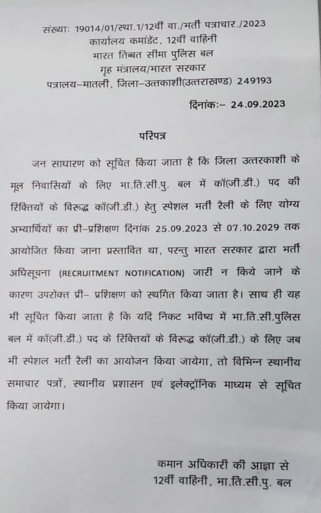 मातली कमाडेंट कार्यालय की ओर से 25 सितंबर से युवाओं को भर्ती के लिए ट्रेनिंग दी जानी थी, जिसे अब टाल दिया गया है। हालांकि, आधिकारिक रूप से आईटीबीपी (ITBP) के अधिकारियों की ओर से इस संबंध में कोई आधिकारिक जानकारी नहीं दी गई है।