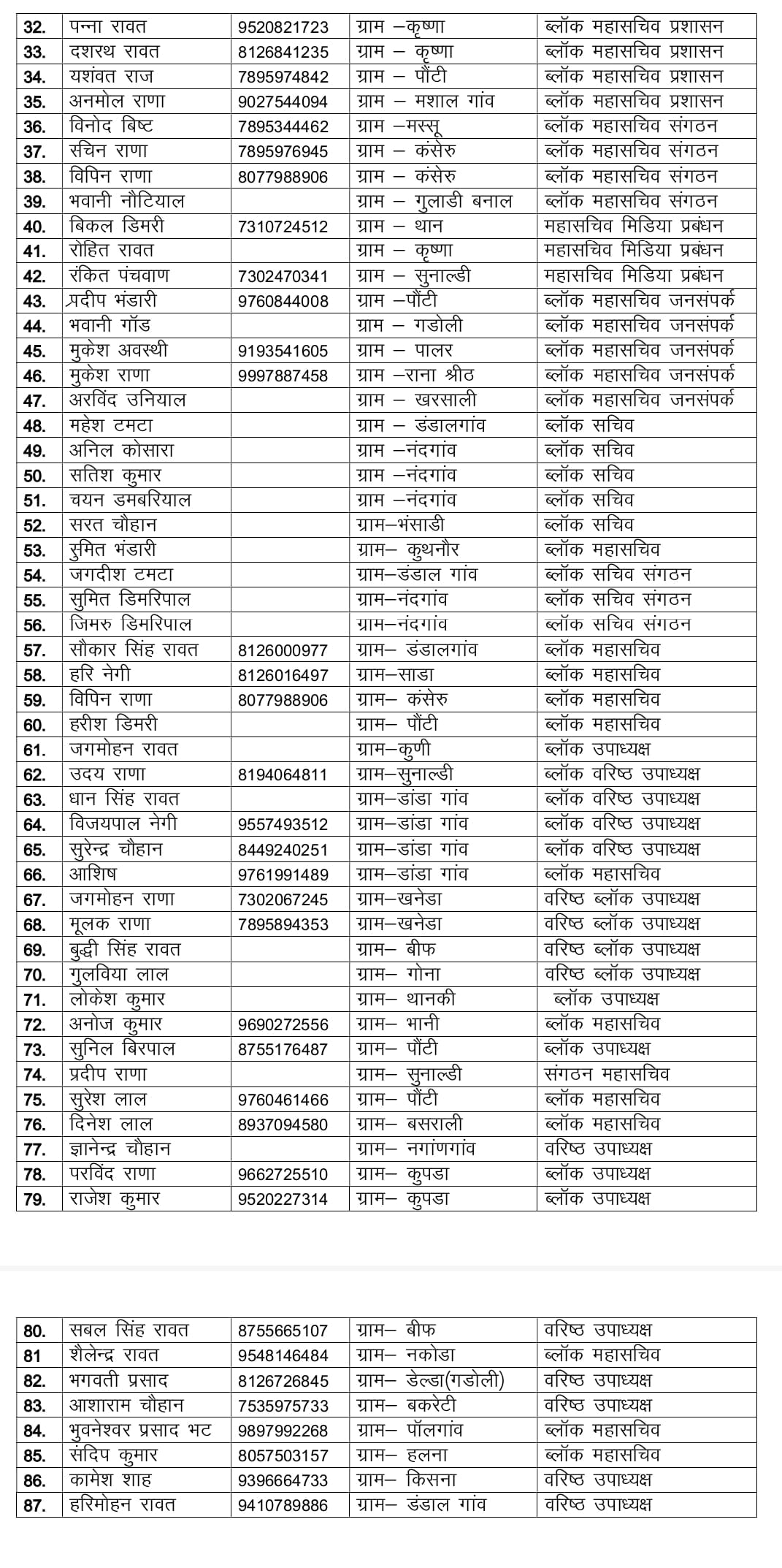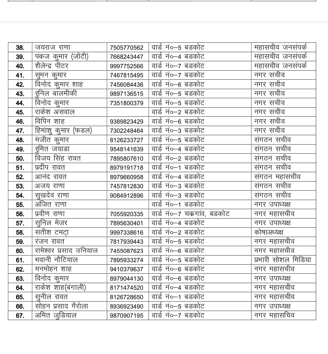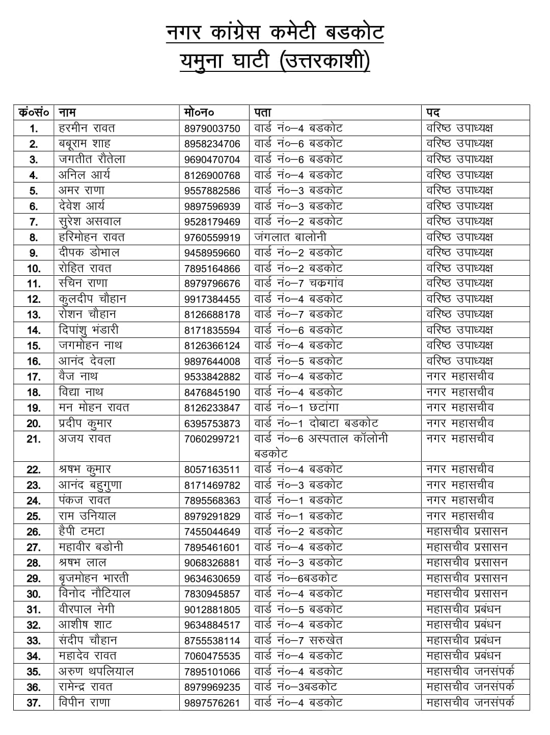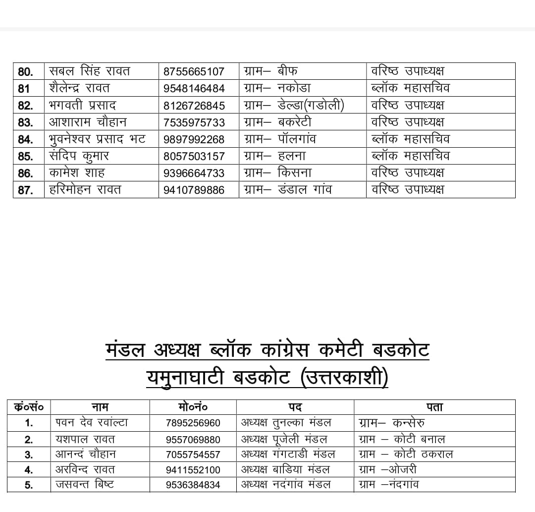 बड़कोट : नगर कांग्रेस कमेटी बड़कोट और ब्लॉक कांग्रेस कमेटी का विस्तार किया गया है। कार्यकारिणी में युवाओं को मौका दिया गया है। इससे पार्टी को नगर पालिका चुनाव में बड़ा फायदा मिल सकता है। इनमें ज्यादातर ओ युवा हैं, जो लंबे समय से पार्टी से जुड़े थे, लेकिन उनको कभी मुख्यधारा में शामिल नहीं किया गया था।
