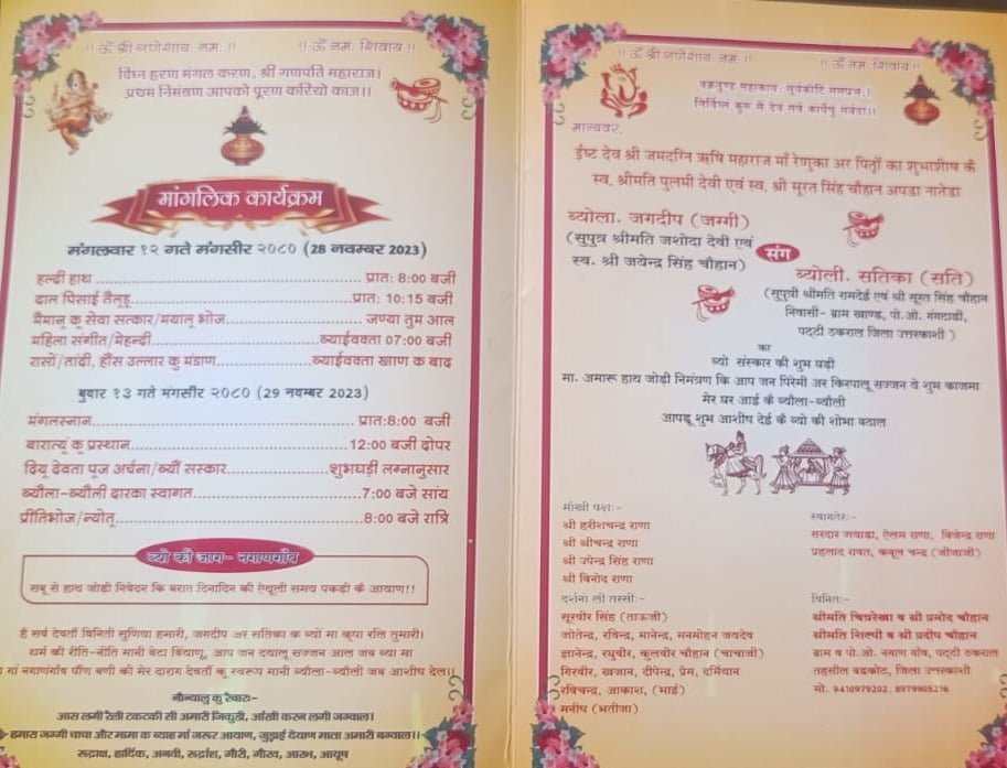 दूसरा कार्ड नगांणगांव निवासी जगदीप चौहान की शादी का है। जगदीप चौहान ने भी लोक भाषा रवांल्टी में अपनी शादी का कार्ड छापा है। देखते ही देखते उनकी शादी का कार्ड सोशल मीडिया में वायरल होने लगा है। इससे पहले सुनारा गांव की एक शादी का कार्ड पिछले दिनों रवांल्टी में छापा गया था। वह भी खूब वायरल हुआ था। लोग इन दोनों कोर्डों से सीख लेने की बात कर रह हैं कि सभी को इसी तरह से अपनी लोक भाषा को संरक्षित करने में भूमिका निभानी चाहिए। लोक भाषा को संरक्षित और संवर्द्धित करना हम सभी की जिम्मेदारी है।