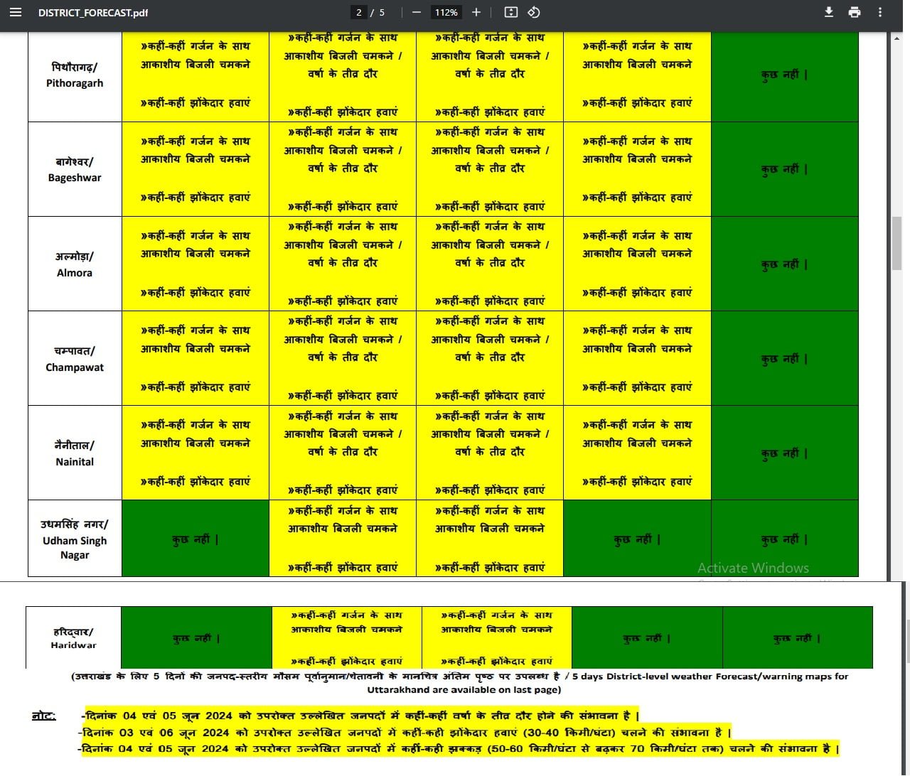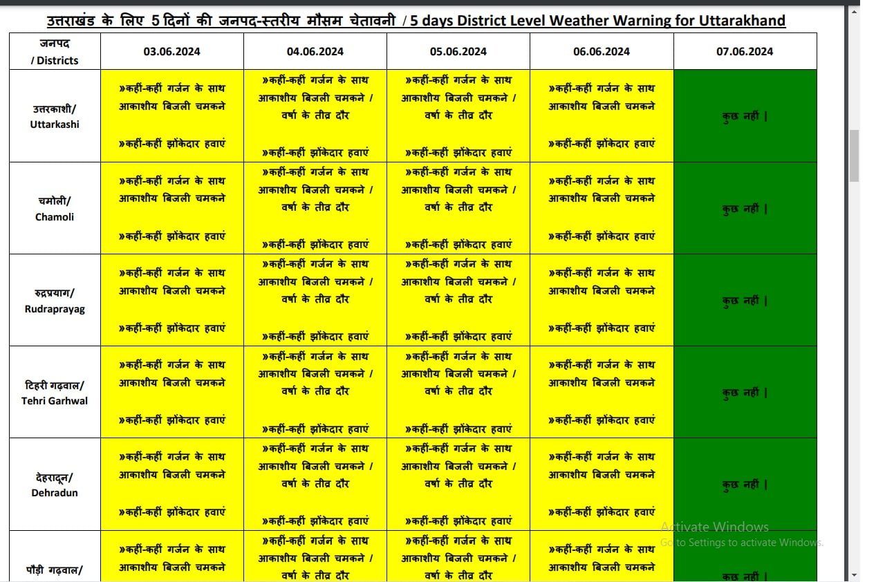 मौसम विभाग के अनुसार 3 से 6 जून तक उत्तरकाशी, चमोली, रुद्रप्रयाग, पौड़ी, देहरादून, टिहरी, हरिद्वार, नैनीताल, पिथैरागढ़, अल्मोड़ा, बागेश्वर, चम्पावत और ऊधमसिंह नगर जिलों के लिए येलो अलर्ट किया है। हरिद्वार और ऊधमसिंह नगर में आज मौसम साफ है। तापमान में कुछ गिरावट जरूर दर्ज की गई है। हालांकि, वह नाकाफी है।