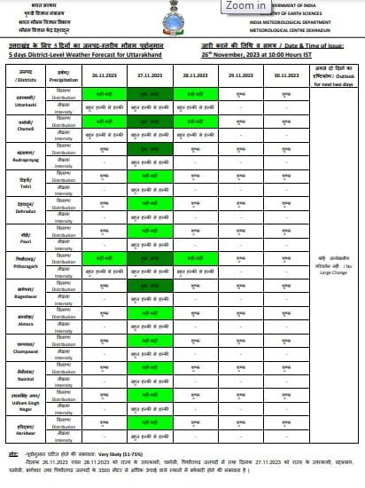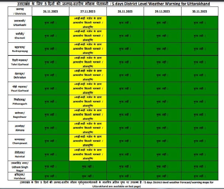 देहरादून: मौसम करवट बदलने वाला है। मौसम विभाग ने अगले तीन दिनों के लिए येलो अलर्ट जारी किया है। खासकर 27 रवंबर के लिए मौसम विभाग ने सकर्त रहने के लिए कहा है। बारिश का अलर्ट जारी होने के साथ ही उत्तरकाशी टनल में फंसे मजदूरों के परिजनों और रेस्क्यू में जुटी एजेंसियों की चिंता बढ़ा दी है।